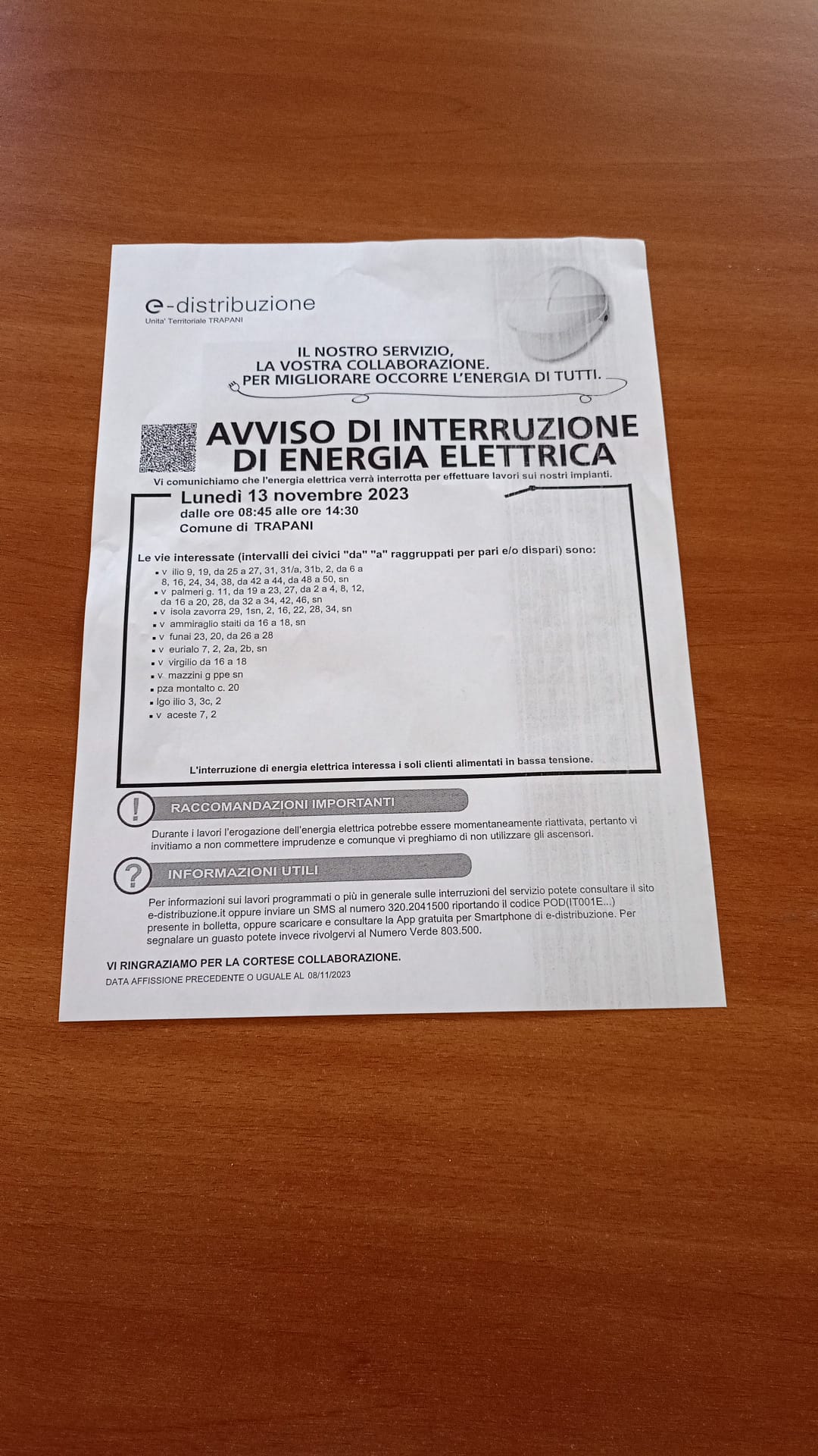 Circ. n. 73: Avviso interruzione energia elettrica via Virgilio n. 16 per il giorno 13/11/2023